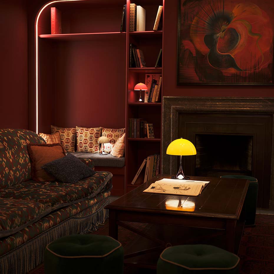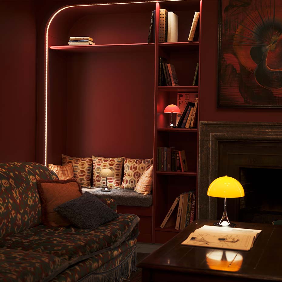 Panthella formgavs av Verner Panton 1971 och är fortfarande en av hans mest populära lampor. De organiska formerna är typiska för hans design. Panthella ger ett mycket behagligt och mjuk ljus, där både foten och skärmen fungerar som en ljusreflektor.