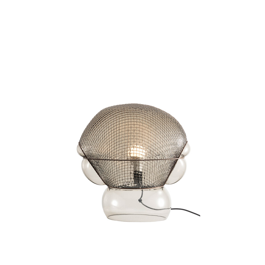 Patroclo Bordslampa från Artemide är mer än en bordslampa, det är ett konstverk i glas och metall. Den munblåsta glaskroppen formas innanför ett handgjort metallnät av värmetåliga ståltrådar som bildar ett oregelbundet rombiskt mönster.