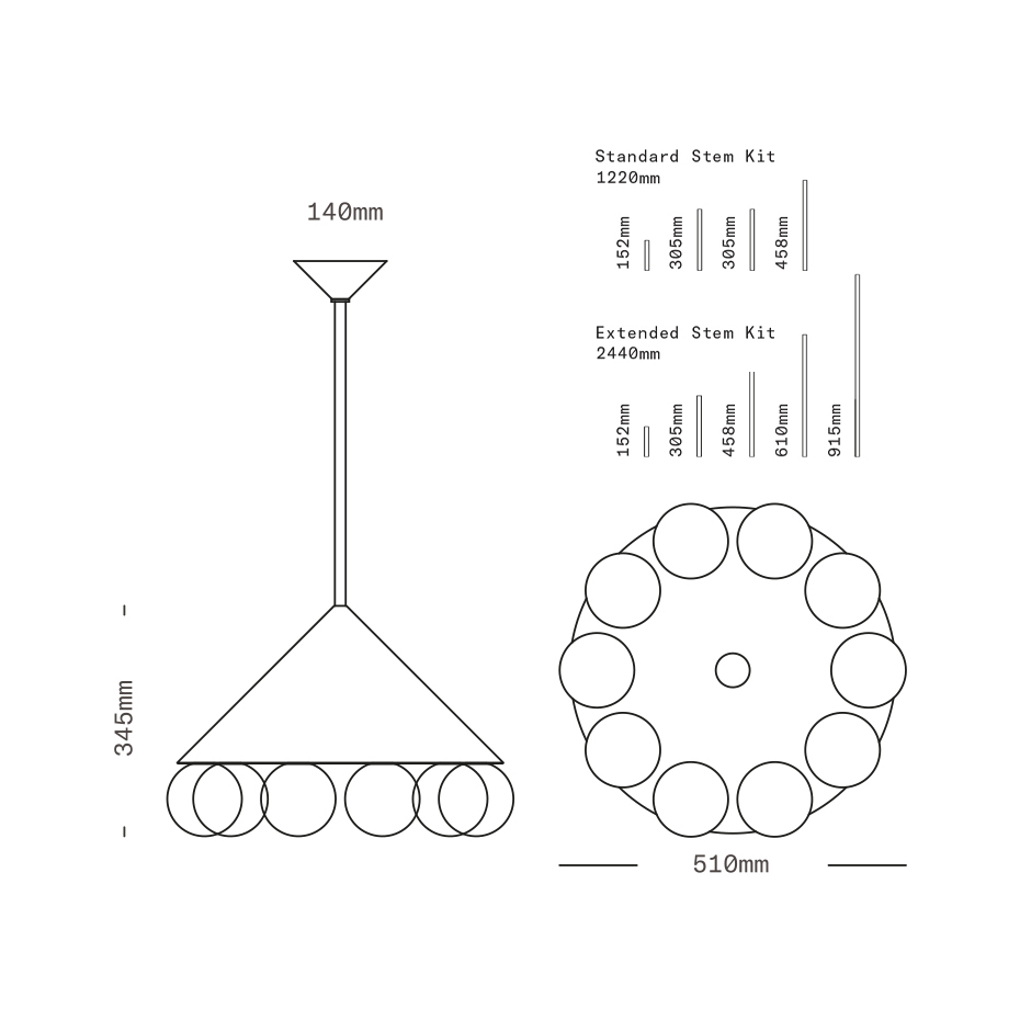 Peak Ljuskrona från SkLO kombinerar lekfullhet och elegans med sina ringar av munblåsta glaskupor placerade under en konform och upphängda i en enkel stång. Takfästet speglar lampans form med en mindre kon i samma design. Ljuskronan lyfter fram enkla geometriska former där proportionerna är noggrant avvägda och varje detalj genomtänkt.