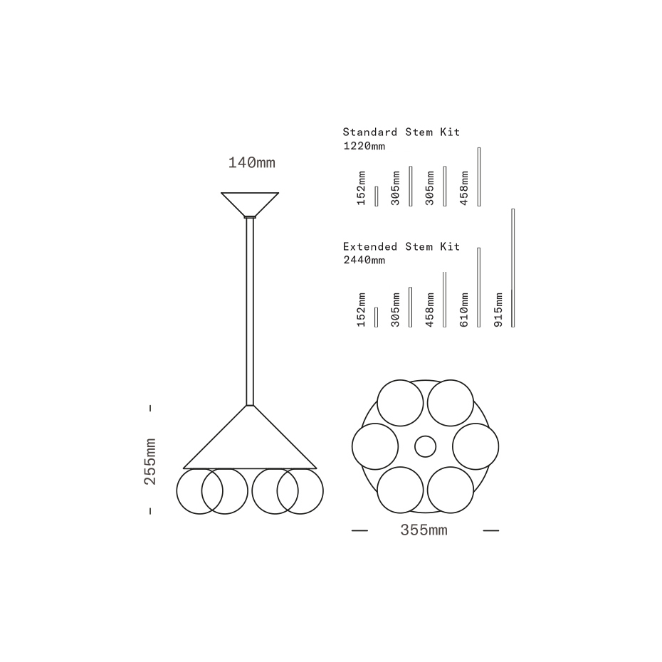 Peak Ljuskrona från SkLO kombinerar lekfullhet och elegans med sina ringar av munblåsta glaskupor placerade under en konform och upphängda i en enkel stång. Takfästet speglar lampans form med en mindre kon i samma design. Ljuskronan lyfter fram enkla geometriska former där proportionerna är noggrant avvägda och varje detalj genomtänkt.