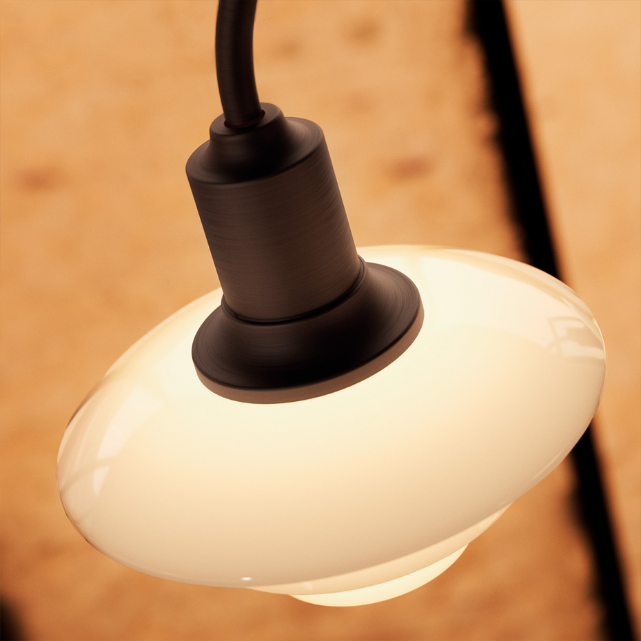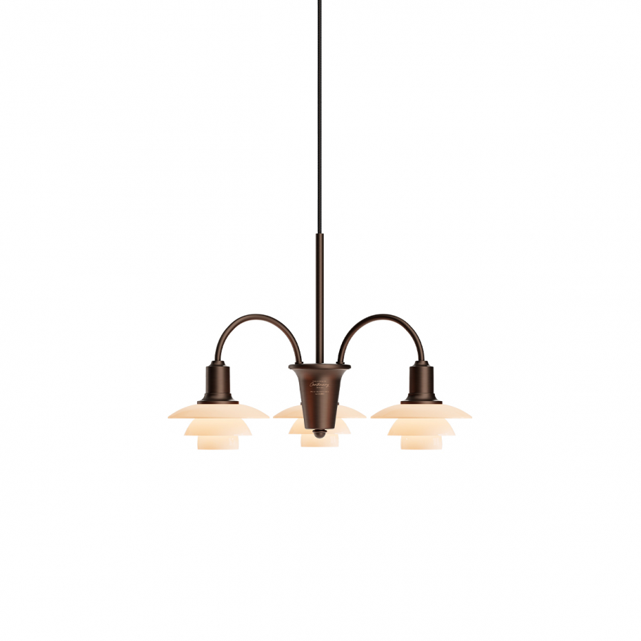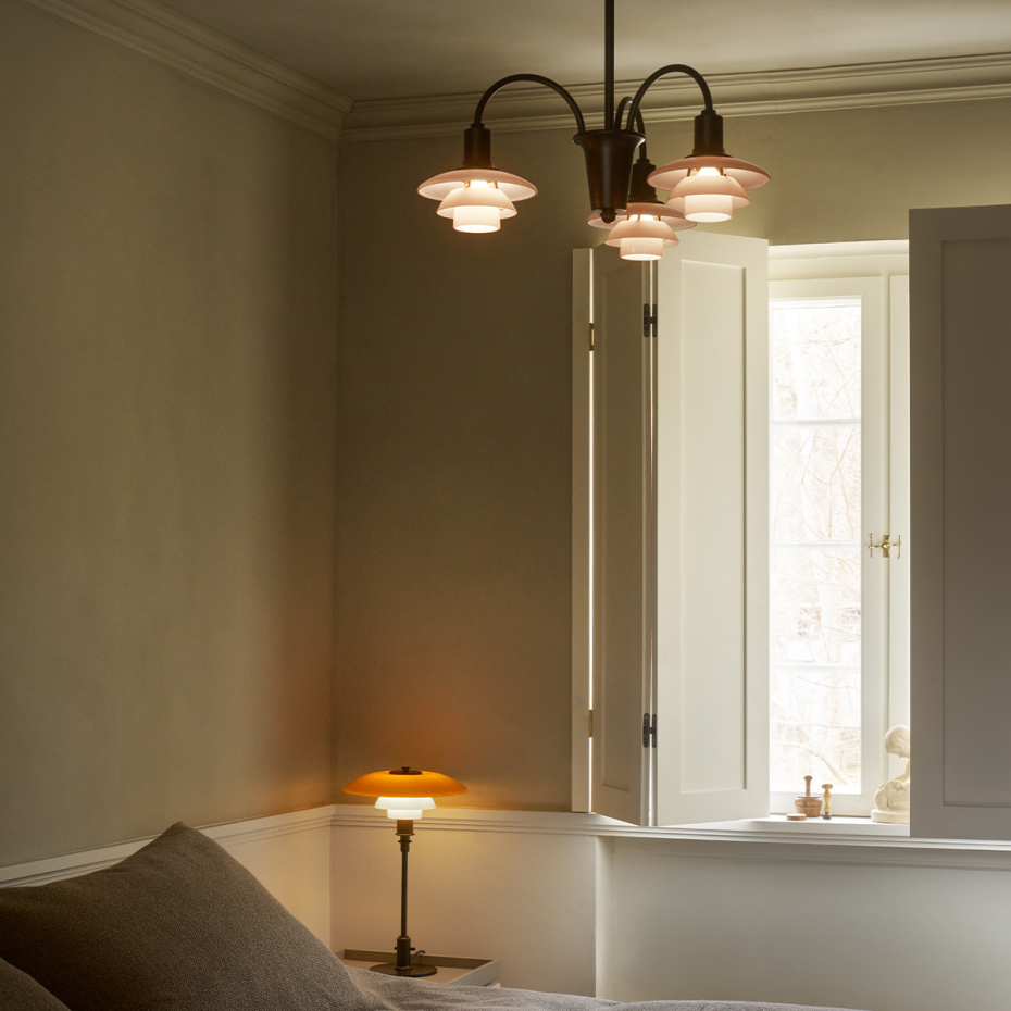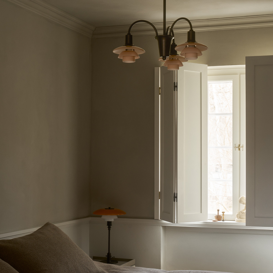 PH 1/1 Ljuskrona 3 Centenary Edition från Louis Poulsen är en exklusiv jubileumsutgåva baserad på Poul Henningsens ikoniska "Bombardement Chandelier" och hans reflekterande treskärmssystem från 1926. Denna 3-armade version kombinerar en stomme i åldrad mässing med munblåsta glasskärmar i den unika färgen Dusty Terracotta. Skärmarna har en blank utsida och en sandblästrad, mattvit insida som skapar ett mjukt, balanserat och helt bländfritt ljus.