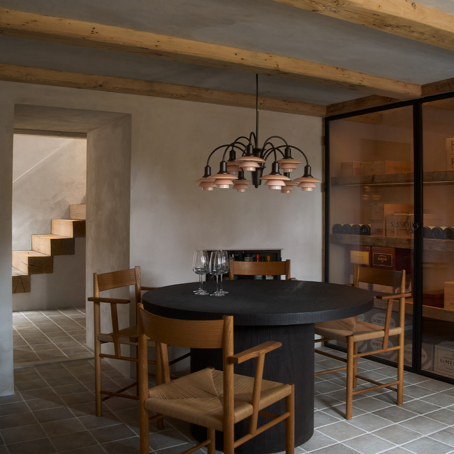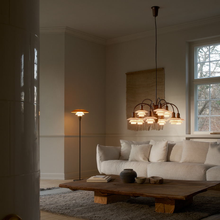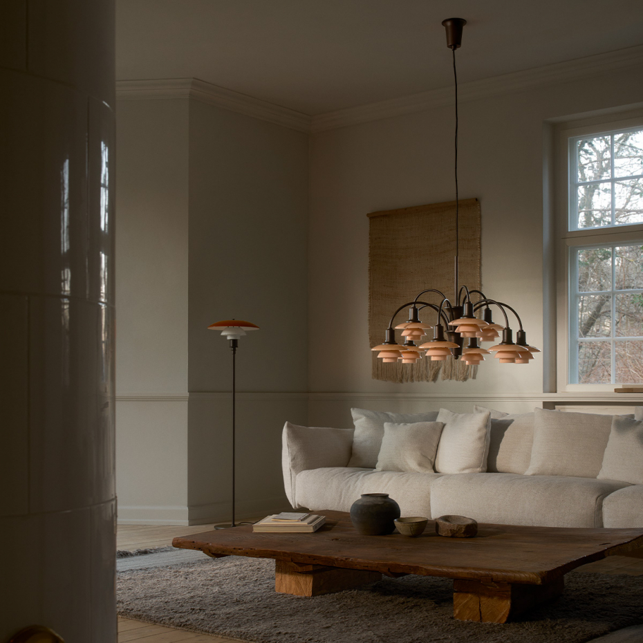PH 1/1 Ljuskrona 9 Centenary Edition från Louis Poulsen är den mest storslagna versionen i jubileumsserien som hyllar Poul Henningsens geniala treskärmssystem och den klassiska "Bombardement"-ljuskronan. Med sina nio armar fördelade på vertikalt staplade kärnor utgör den en imponerande skulptural mittpunkt. Stommen i åldrad mässing bär upp skärmar i munblåst opalglas i färgen Dusty Terracotta, som med sin blanka utsida och sandblästrade insida sprider ett varmt, mjukt och helt bländfritt ljus.
