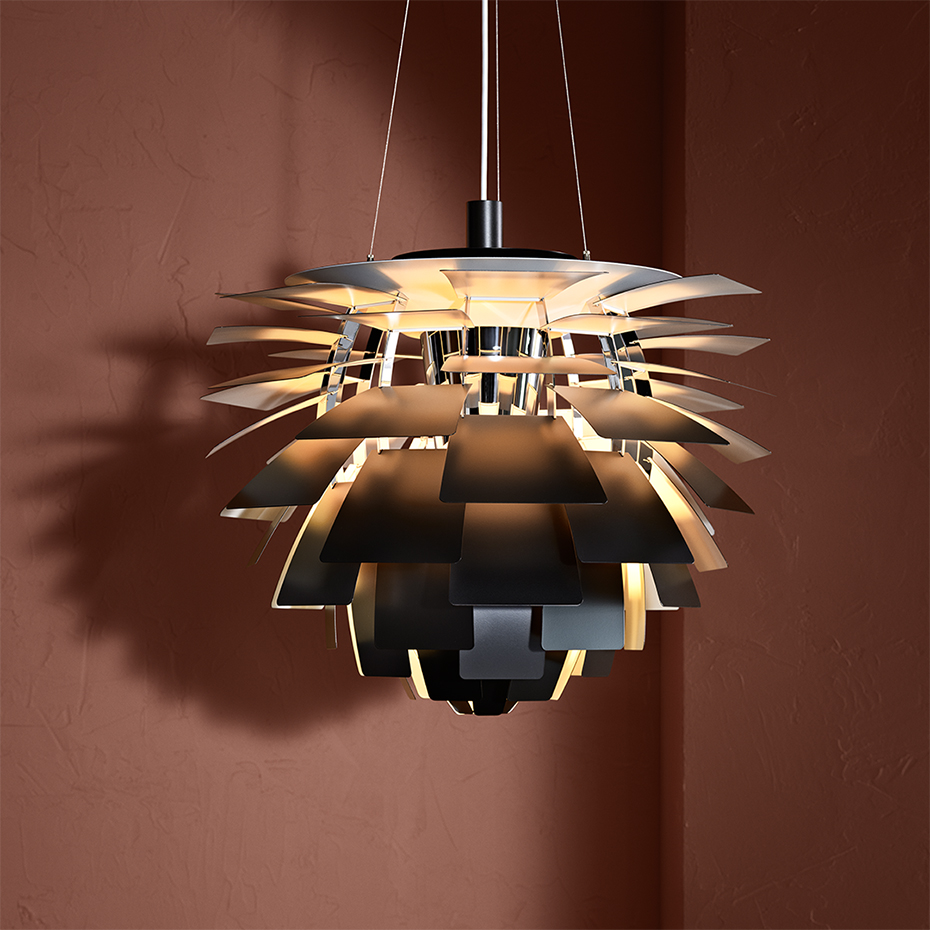 PH Artichoke Ø600 Pendel Svart från Louis Poulsen är den senaste Artichoke-modellen. PH Kotte, eller PH Artichoke (kronärtskocka på engelska), är en av världens mest kända lampor. Poul Henningsen designade den till restaurang Langelinie Pavillonen i Köpenhamn 1958, där den fortfarande hänger. Varje enskilt blad formas och slipas för hand och sätts sedan på plats i precis rätt vinkel för att skapa ett totalt bländfritt ljus. En unik lampa som verkligen fångar ögat.