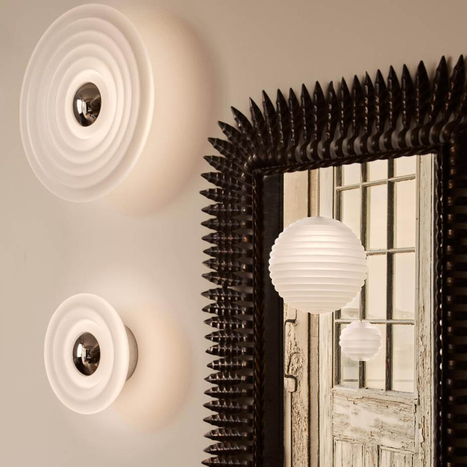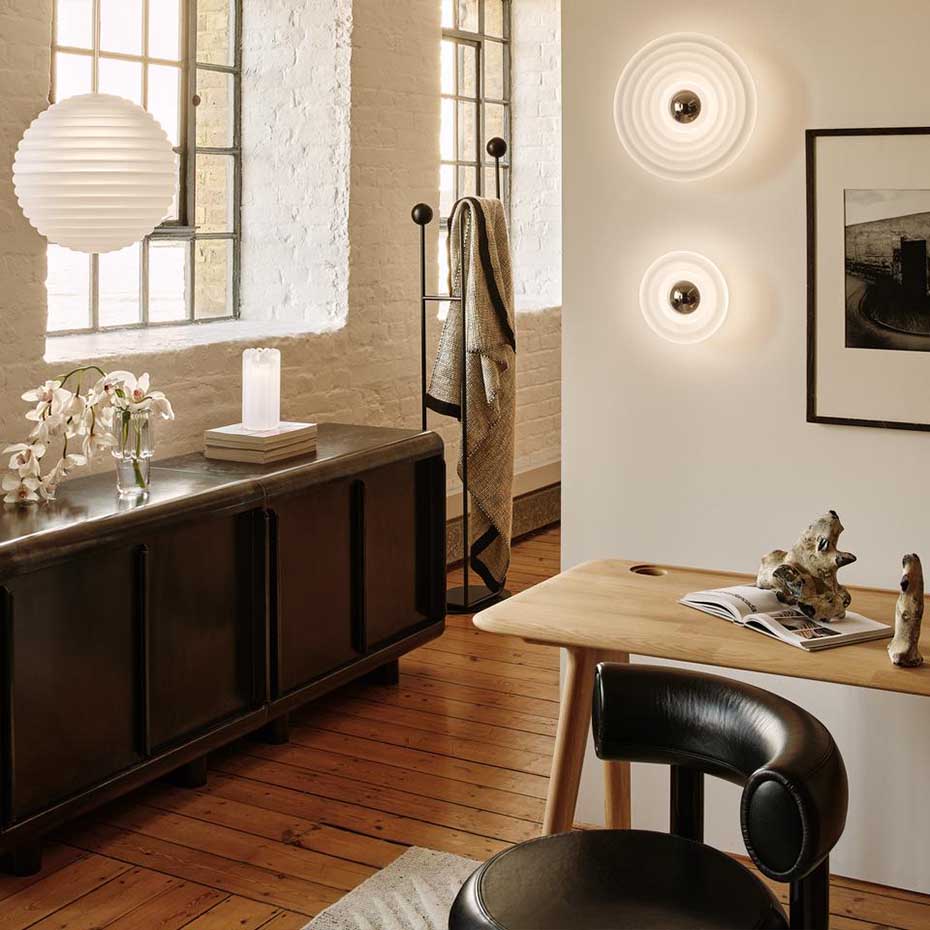 Press Mini Surface från Tom Dixon är en tak- och vägglampa i pressat, sandblästrat glas med kraftig närvaro. IP55-klassningen gör den lämplig även för badrum eller utomhusbruk. Den solida konstruktionen ger ett distinkt ljus och stark formkänsla.