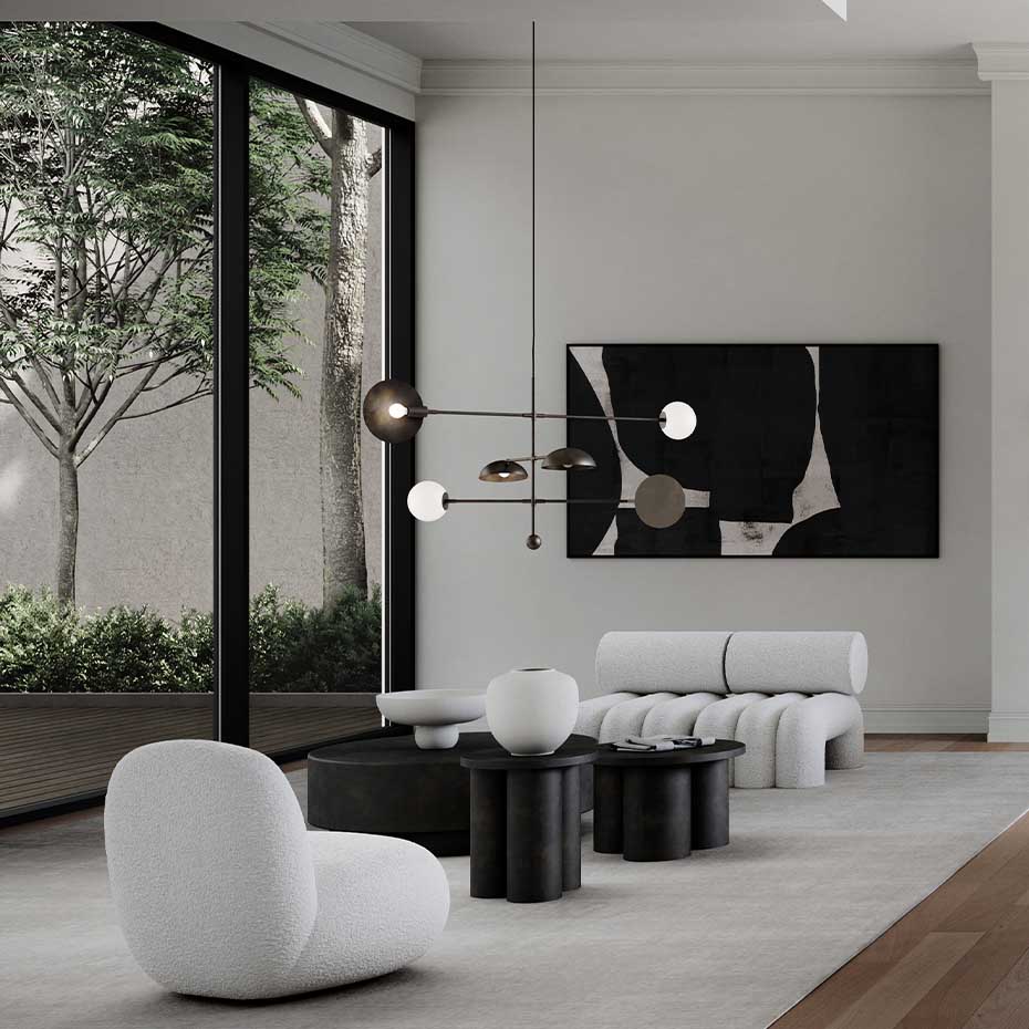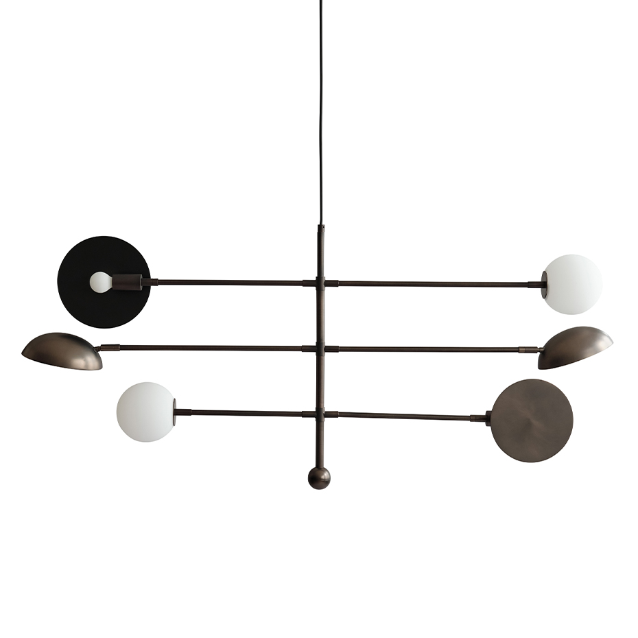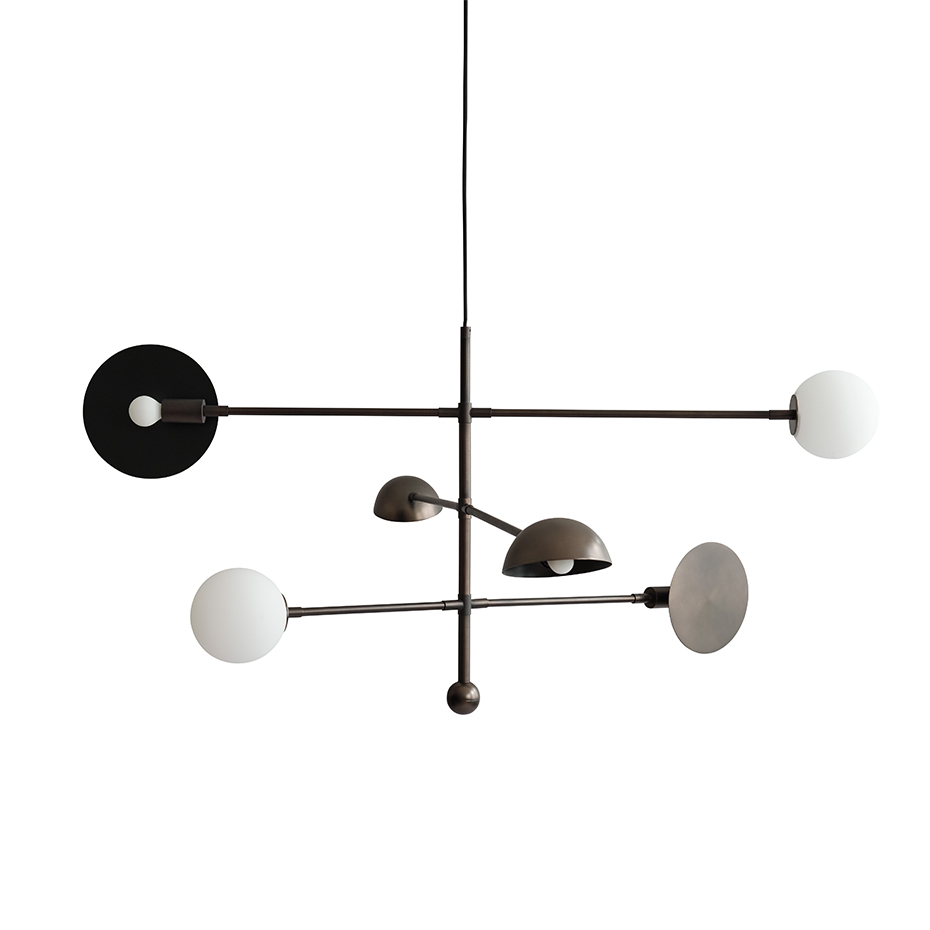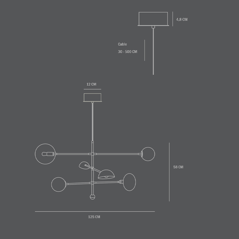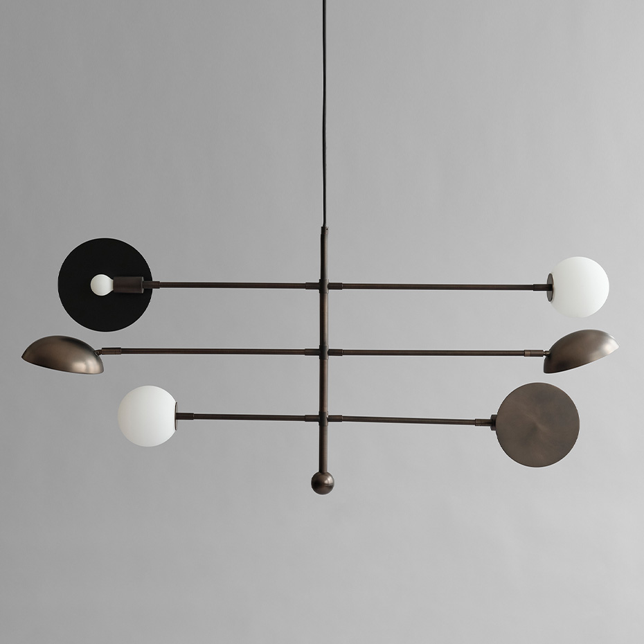 Sahn Chandelier hämtar inspiration från 70-talets futuristiska design och rymdålderns estetik. Tillgänglig i krom eller brons är denna tidlösa ljuskrona skapad för mångsidighet – varje arm och lampskärm kan vridas och justeras för att skapa dynamiska, skulpturala ljusformationer anpassade till ditt rum.