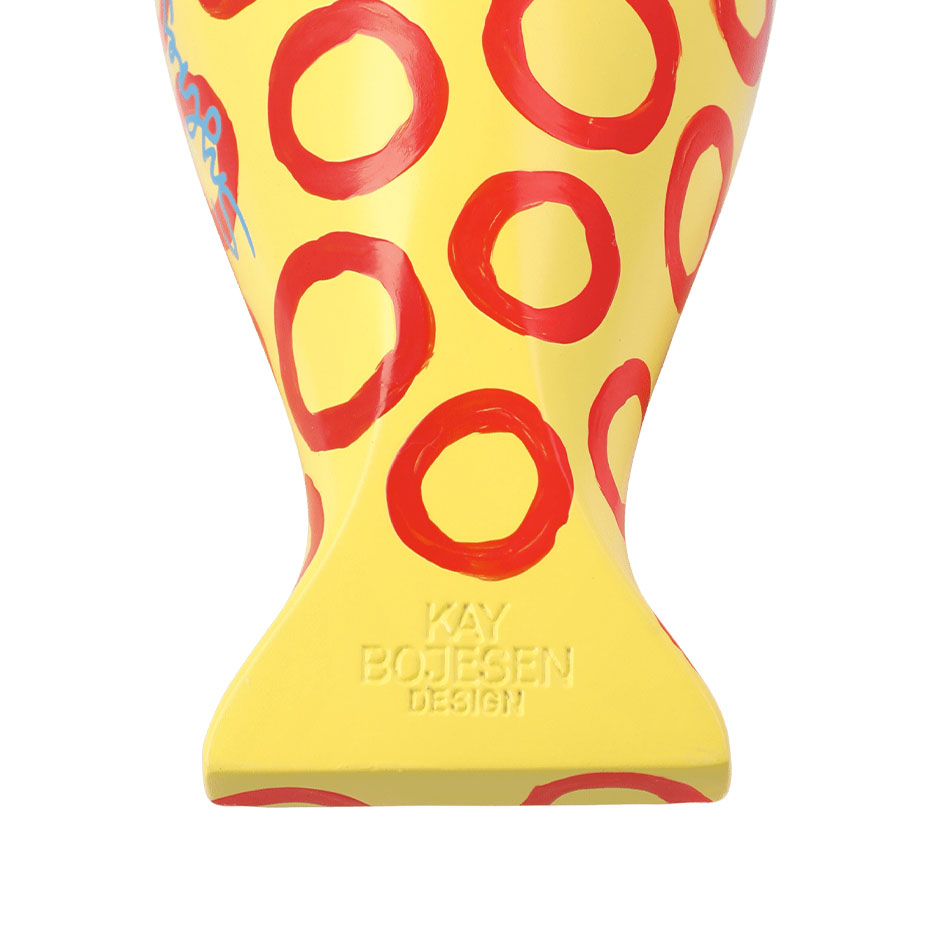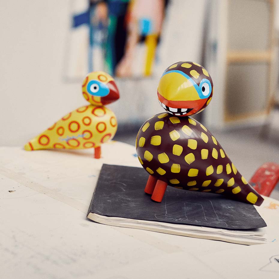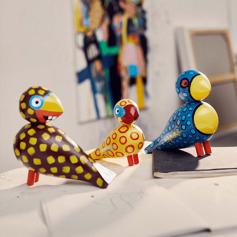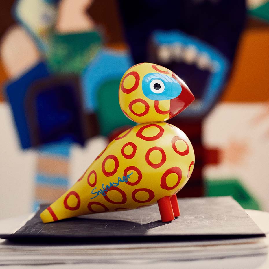 Sångfågel x Leif Sylvester 2025 H15,5 cm Blue Eyes är en unik konstutgåva där dansk design möter dansk konst. Den ikoniska Kay Bojesen-sångfågeln har fått nytt liv genom Leif Sylvesters handmålade penseldrag, vilket gör varje fågel helt unik. Tillverkad i FSC®-certifierat bokträ och prydd med starka gula och orangea toner, lekfulla cirkelmönster och karakteristiska blå ögon, sprider den både glädje och sommarkänsla. Varje fågel bär konstnärens signatur och blir därmed ett samlarobjekt som förenar humor, originalitet och tidlös design. Eftersom varje exemplar är handmålat är alla fåglar i kollektionen unika.