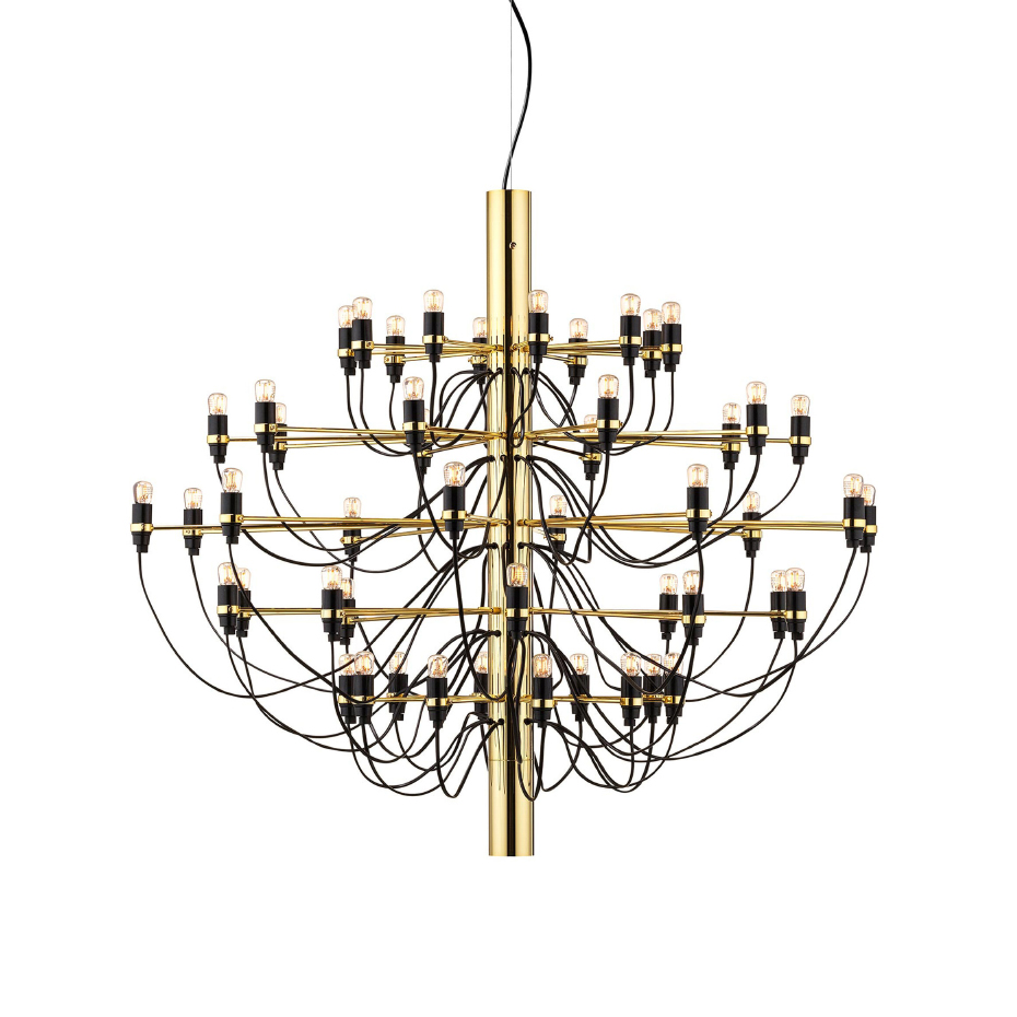 2097, även kallad Sarfattikronan, är en mycket uppskattad klassiker som designades 1958 av just Gino Sarfatti. Gino inspirerades av den klassiska stearinljuskronan där sladdarna symboliserar de svängda armarna. Lampan finns i krom och mässing och med 30 eller 50 lampor.