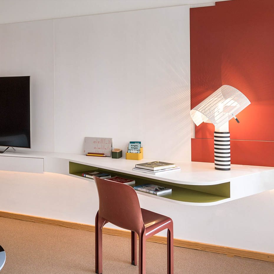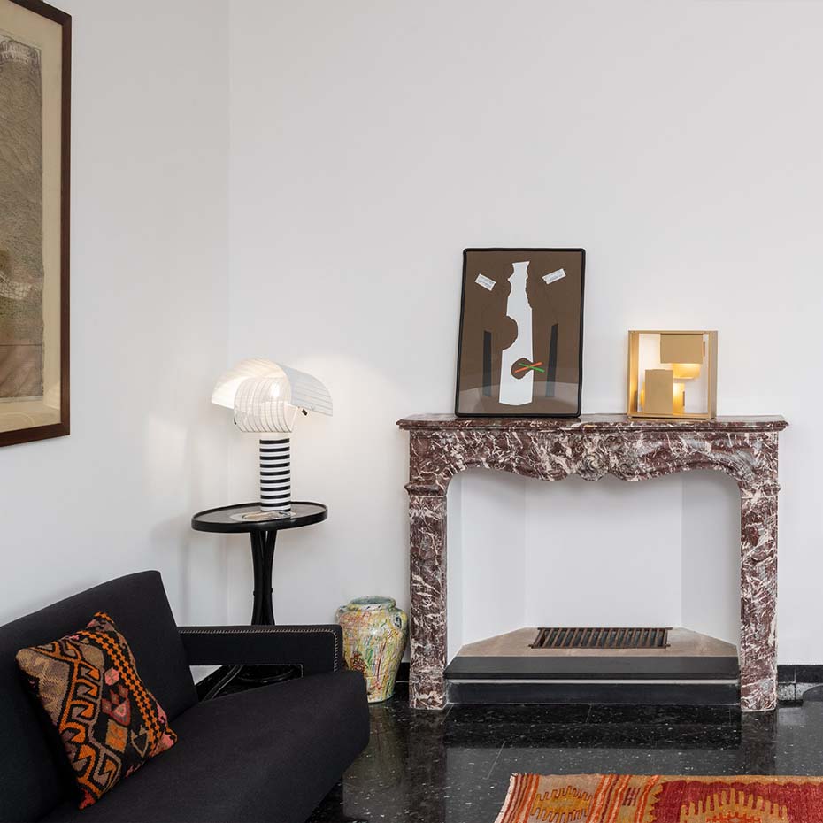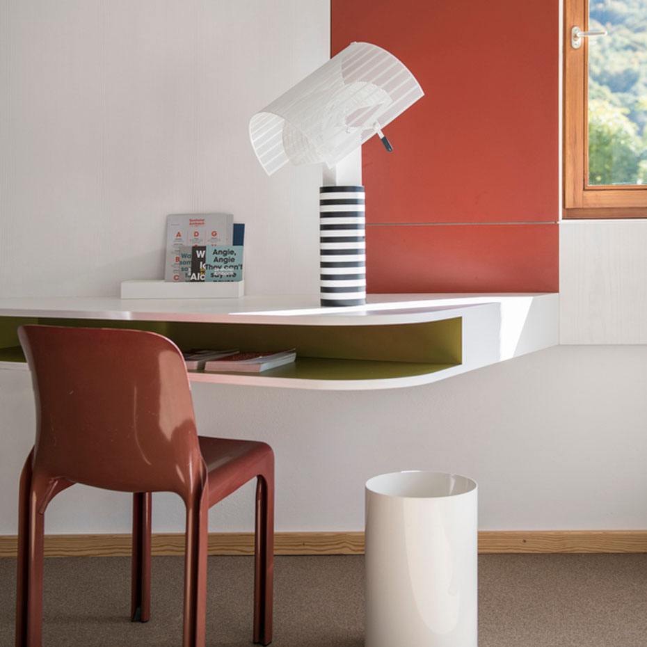 Kombinationen av svart och vitt ger lampan ett grafiskt uttryck, medan de rörliga skärmarna gör det möjligt att styra ljusspridningen efter behov. En klassiker från Artemide som förenar funktion, estetik och tidlös design.