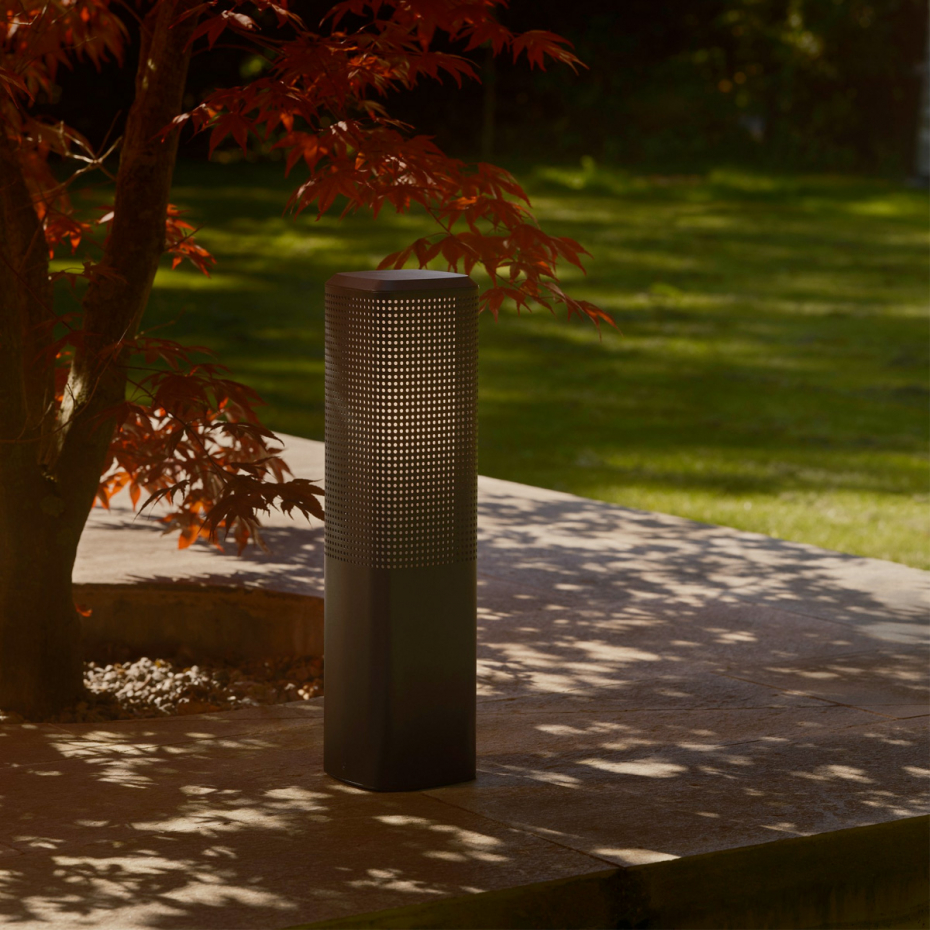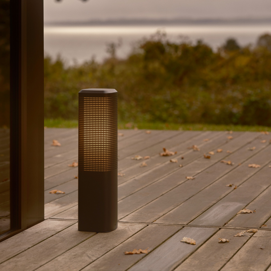 Sidara 45 Pollare Seaside från Nordlux är designad av den välkända studion Jacob Jensen Design och kombinerar modern minimalism med ett raffinerat, arkitektoniskt uttryck. Den perforerade ytan skapar ett vackert samspel mellan ljus och skugga i trädgården eller längs gångstigar.