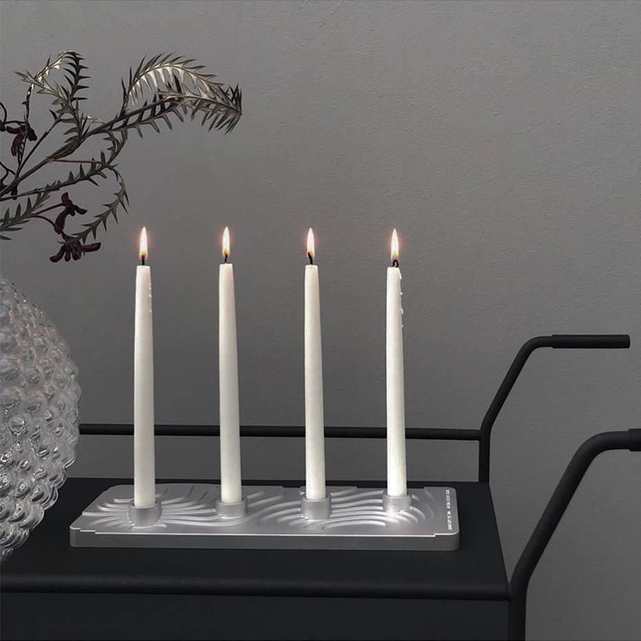 Snowscape 4 Ljushållare från SMD Design är en elegant ljusstake för levande ljus. Formen är inspirerad av vindens spår i snön efter en kylig vinterdag, vilket ger ljusstaken ett poetiskt och naturnära uttryck. Tillverkad i blästrad aluminium får Snowscape en matt, sofistikerad yta som fångar och reflekterar ljuset på ett mjukt sätt. Ljusstaken finns i två storlekar, för ett eller fyra ljus, och skapar en stillsam och stämningsfull atmosfär i rummet.