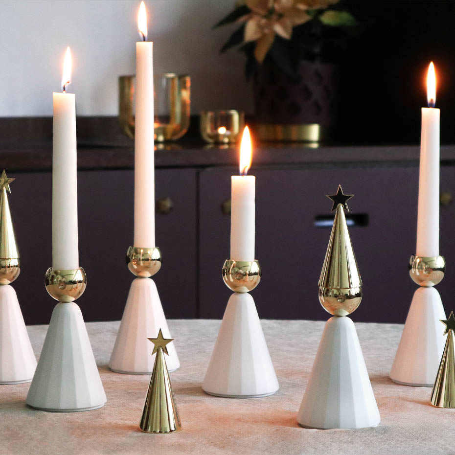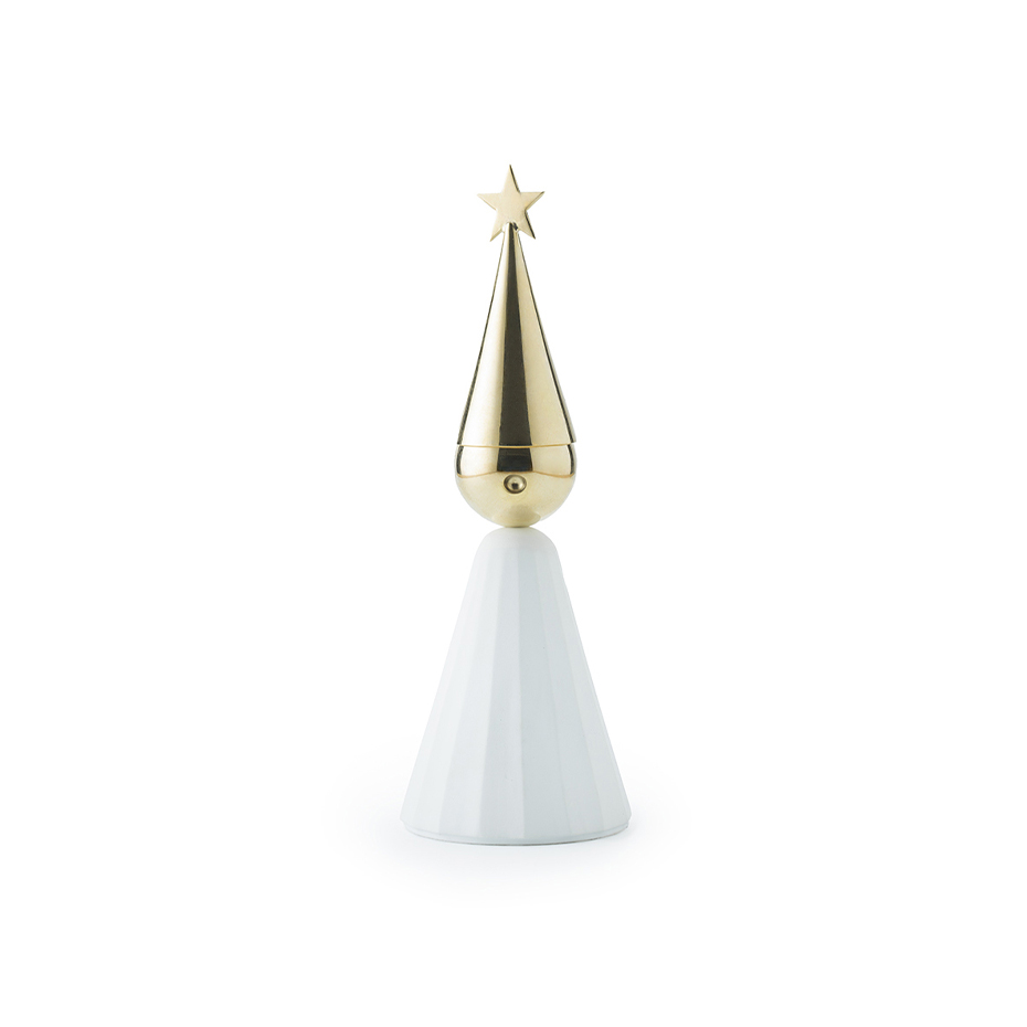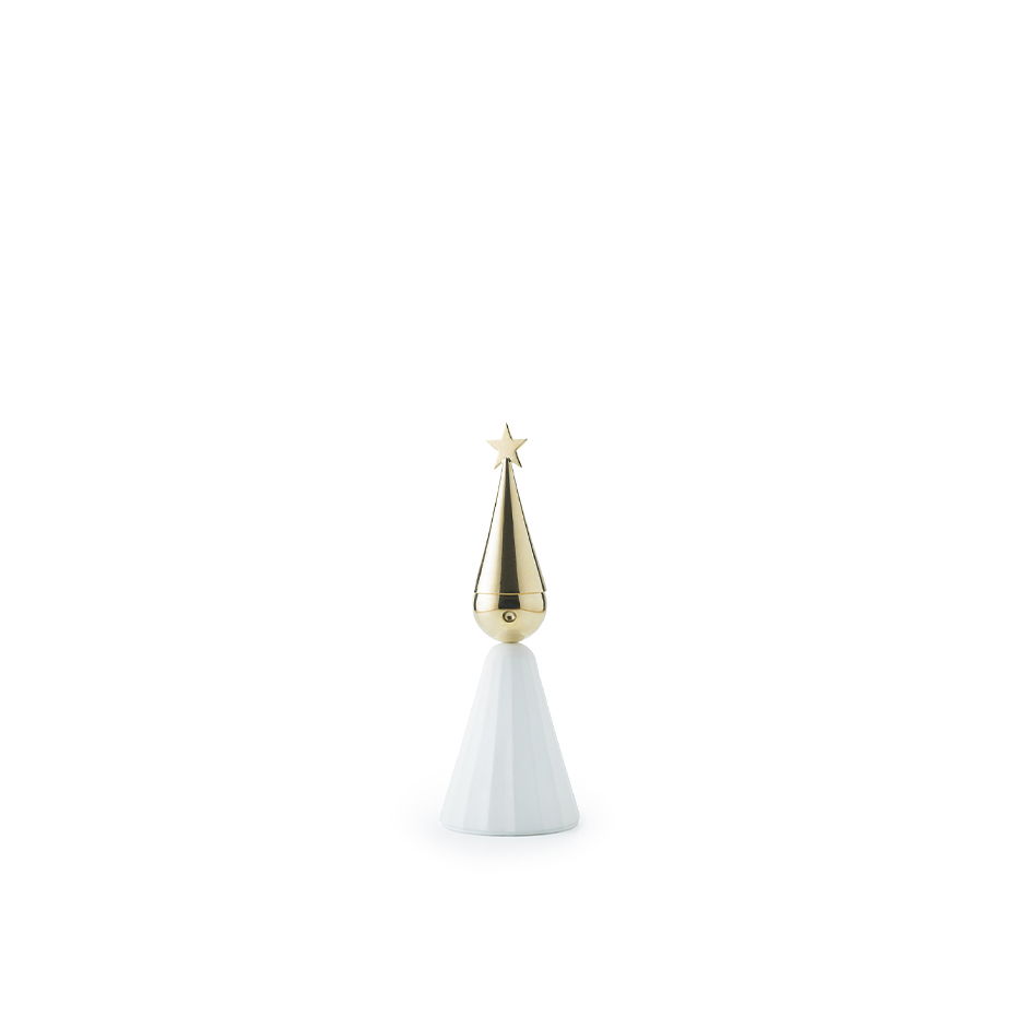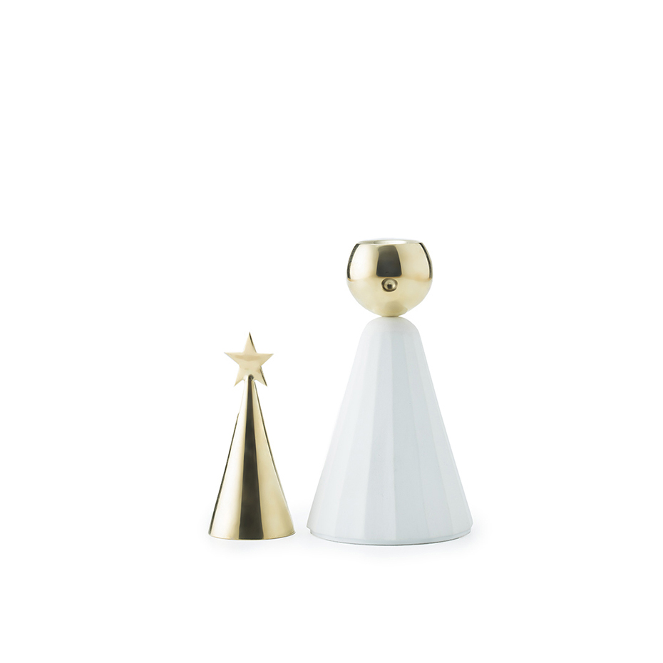 Soprano Ljusstake från Klong är en elegant ljushållare med tillhörande ljussläckare som förenar tradition och modern design. Med sina mässingsdetaljer och vita kappa påminner den om en stjärngosse i luciatåget. Ljussläckaren fungerar även som dekorativ hatt när ljuset brunnit ner. En vacker och omtänksam gåva eller ett personligt inslag i jultraditionen. Ljussläckaren säljs även separat som Stjärnstopp.
