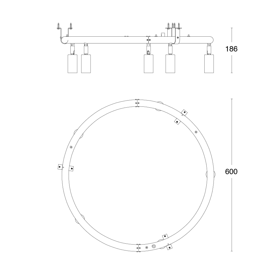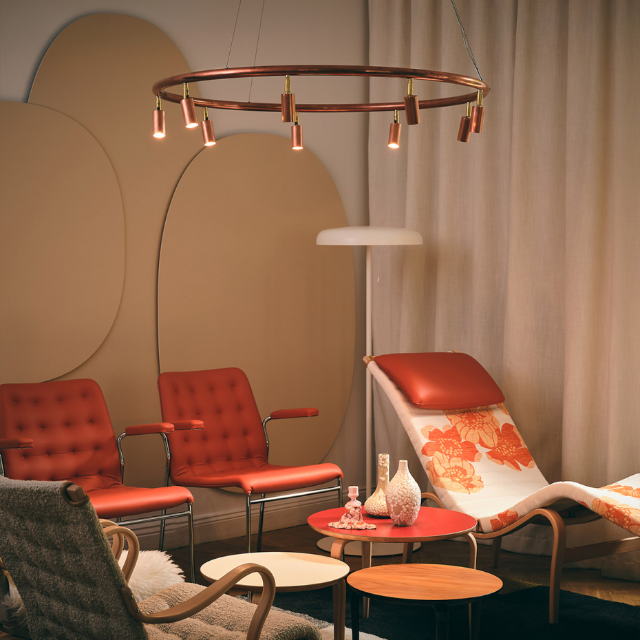 Diameter: 60 cm Höjd: 18,6 cm Ljuskälla: Ingår Material: Rå koppar/Mässing Montering: Monteras med medföljande fästband eller vajerupphäng Sladdlängd: 3 m Sockel: 5 x GU10, MR11 Mini 3,5 W 250 lm 2200-2700 K CRI 90 dim-to-warm Övrigt: Observera att de råa materialen förändras med tiden och utvecklar en patina – en viktig del av designen och ett kvitto på hantverk och ärliga material.