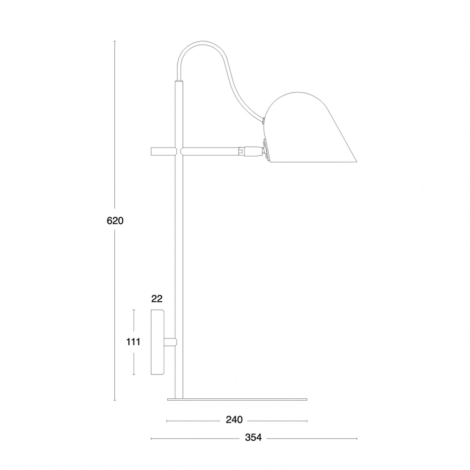 Diameter: 11,1 cm Djup: 35,4 cm Höjd: 62 cm Ljuskälla: Integrerad Material: Lackerad metall/Mässing Montering: För fast montage Sockel: LED, 6 W 660 lm 2700 K Övrigt: Strömbrytare inne i skärmen. Justerbar skärm. Ej dimbar.