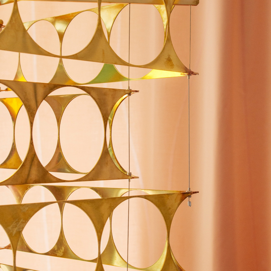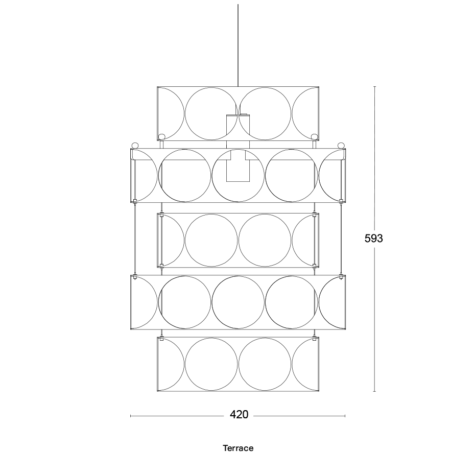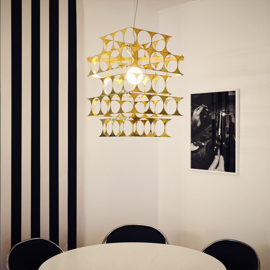 Örsjö Terrace Ljuskrona bygger på återbrukade metallstrimlor från produktionen av Star 1, där varje del får ett eget uttryck. Konstruktionen skapar ett riktat ljus och en levande siluett. Placera den över matbordet, i en entré eller i ett rum där material och form får definiera helheten.