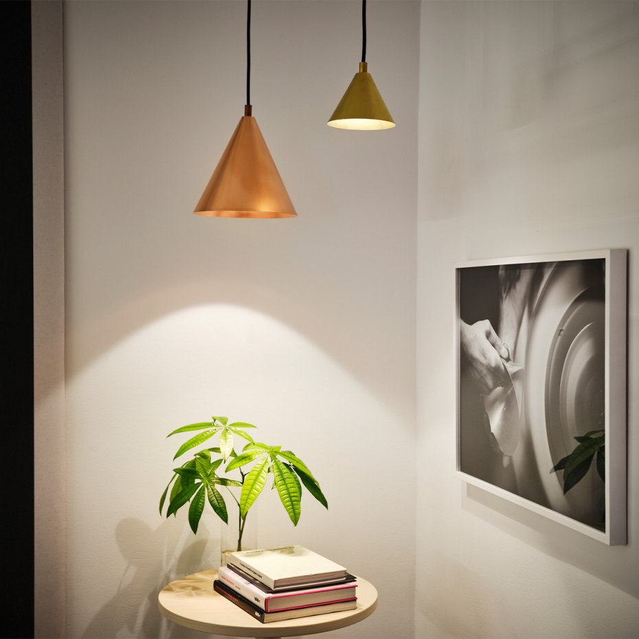 Diameter: 24 cm Energiklass: F Höjd: 22,5 cm IP-klass: 20 Ljuskälla: Integrerad Material: Rå koppar Sladdlängd: 1,4 m Sockel: LED, 6 W 600 lm 2700 K CRI >90 Dimbar Övrigt: Takkopp ingår ej. Observera att de råa materialen förändras med tiden och utvecklar en patina – en viktig del av designen och ett kvitto på hantverk och ärliga material.