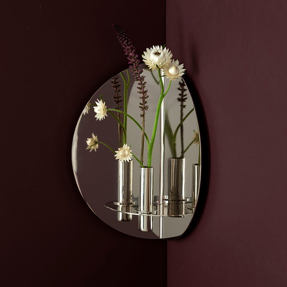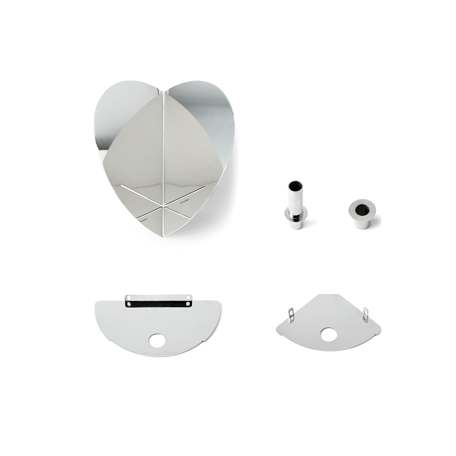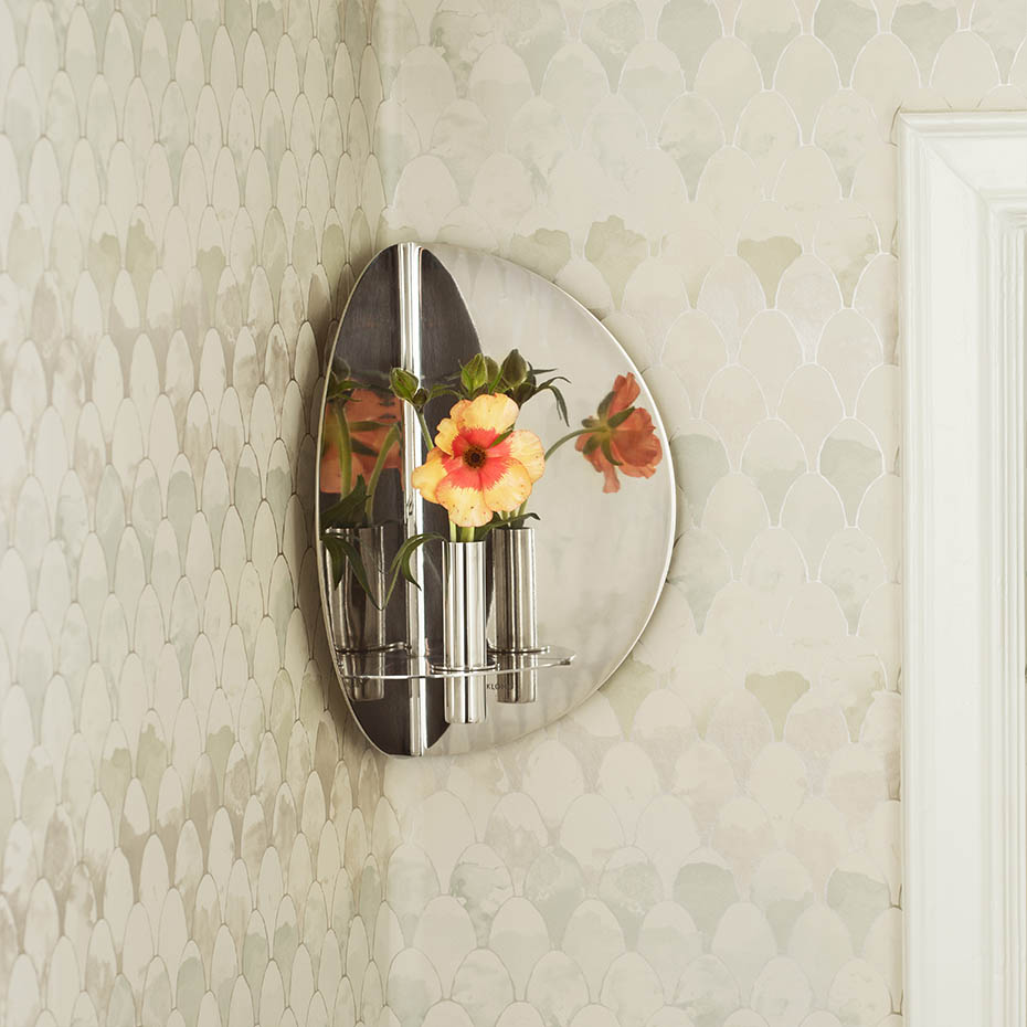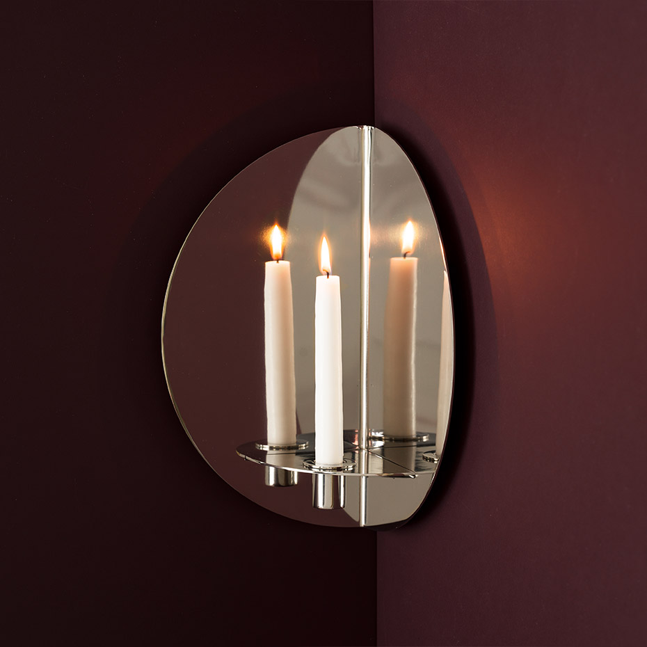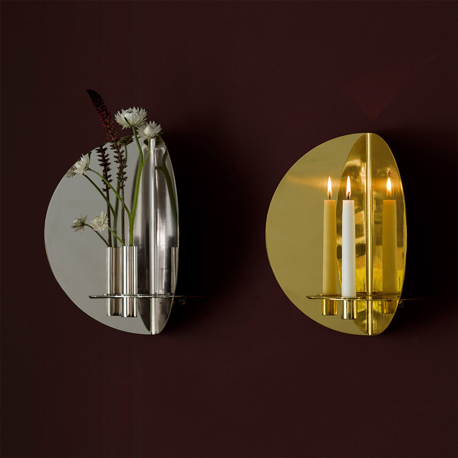 Twilight Lampett från Klong är en elegant väggdekoration i mässing eller rostfritt stål som leker med reflektioner och skapar djup i rummet. Den kan användas med medföljande ljushållare för att sprida ett kluster av ljus eller som vas för att framhäva en blomma ur flera vinklar. En unik balans mellan funktion och skulptur.