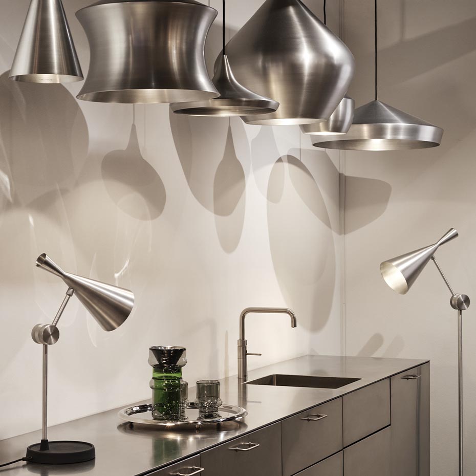 Unbeaten Tall LED Pendel är en vidareutveckling av den ikoniska Beat-serien från Tom Dixon. Till skillnad från de ursprungliga, handhamrade modellerna tillverkas Unbeaten av skickliga hantverkare i Indien med hjälp av maskinverktyg och återvunnet aluminium. Resultatet är en raffinerad pendel med modern precision, som samtidigt bevarar kopplingen till det genuina hantverket bakom Beat.