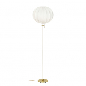 Diameter: 42 cm (skärm), 24 cm (fot) Höjd: 155 cm Ljuskälla: Ingår ej Material: Borstad mässing/Linnetyg Sladdlängd: 2 m Sockel: E27, Max 60 W Övrigt: Dragströmbrytare under skärmen