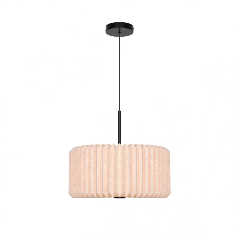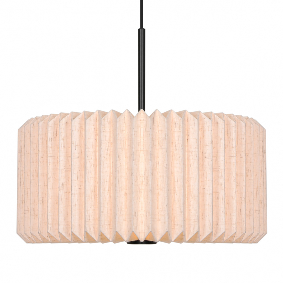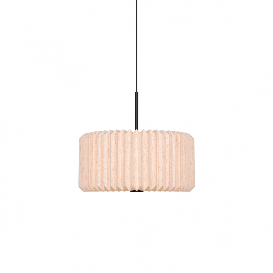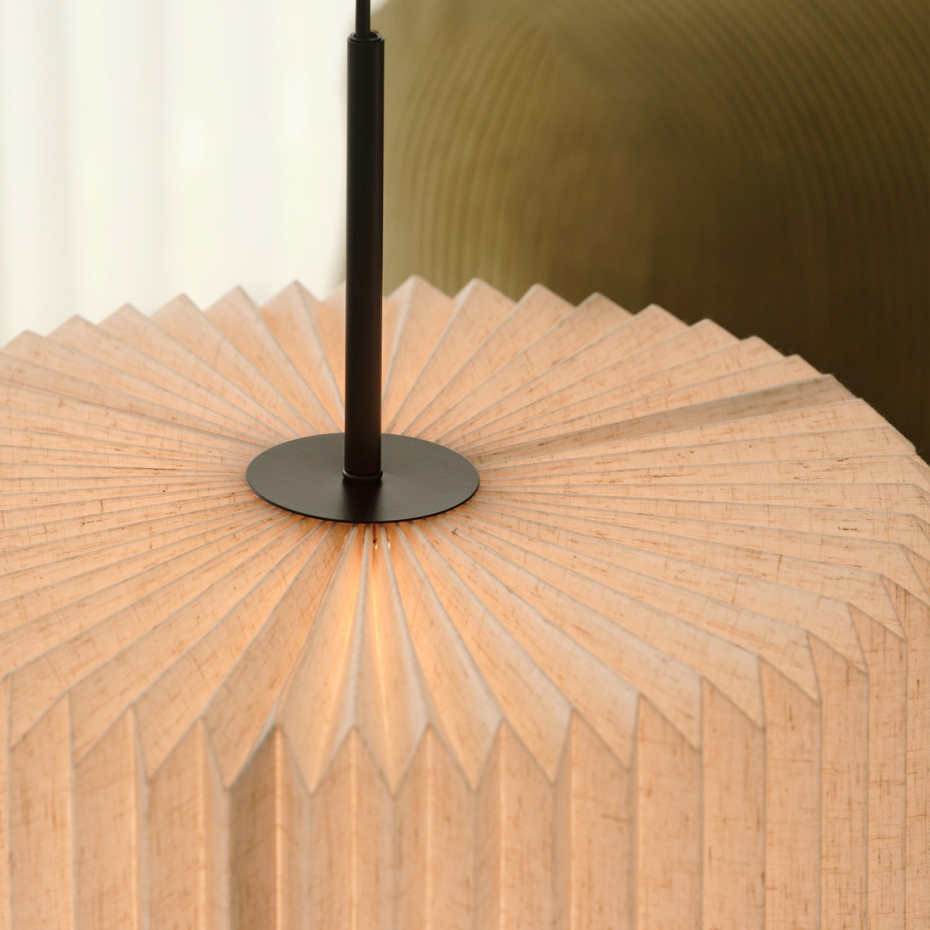 Vivienne 40 Pendel från Nordlux kombinerar tyg och metall i en tidlös och elegant design. Den plisserade textilskärmen ger ett mjukt, dekorativt uttryck och skapar ett diffust ljus som tillför värme och komfort till rummet. Den är ett perfekt val för att få en mjuk belysning ovanför matbordet.